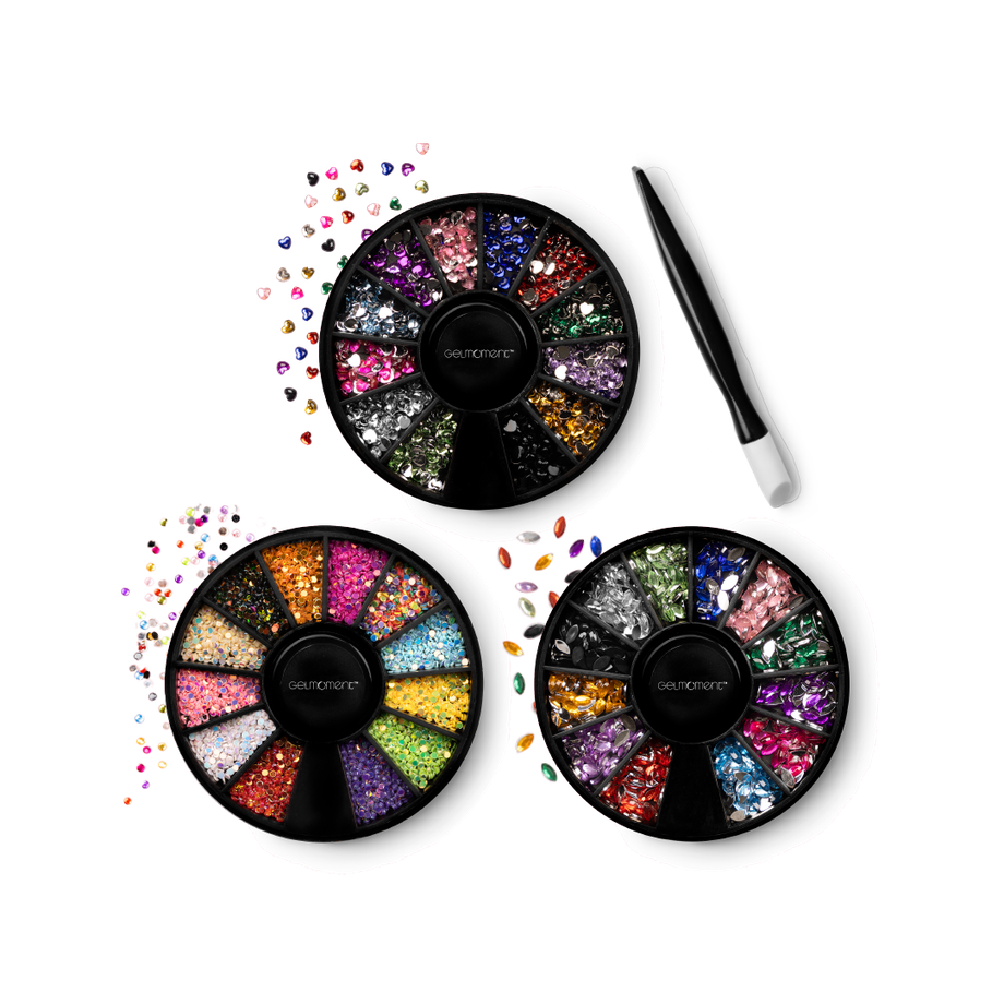 Mini Jewels are an ever-so-charming way to add a sparklingly lavish dimension to your manicure. Each set comes with 12 colours and an applicator stick, bundled together in a GelMoment organza sachet.