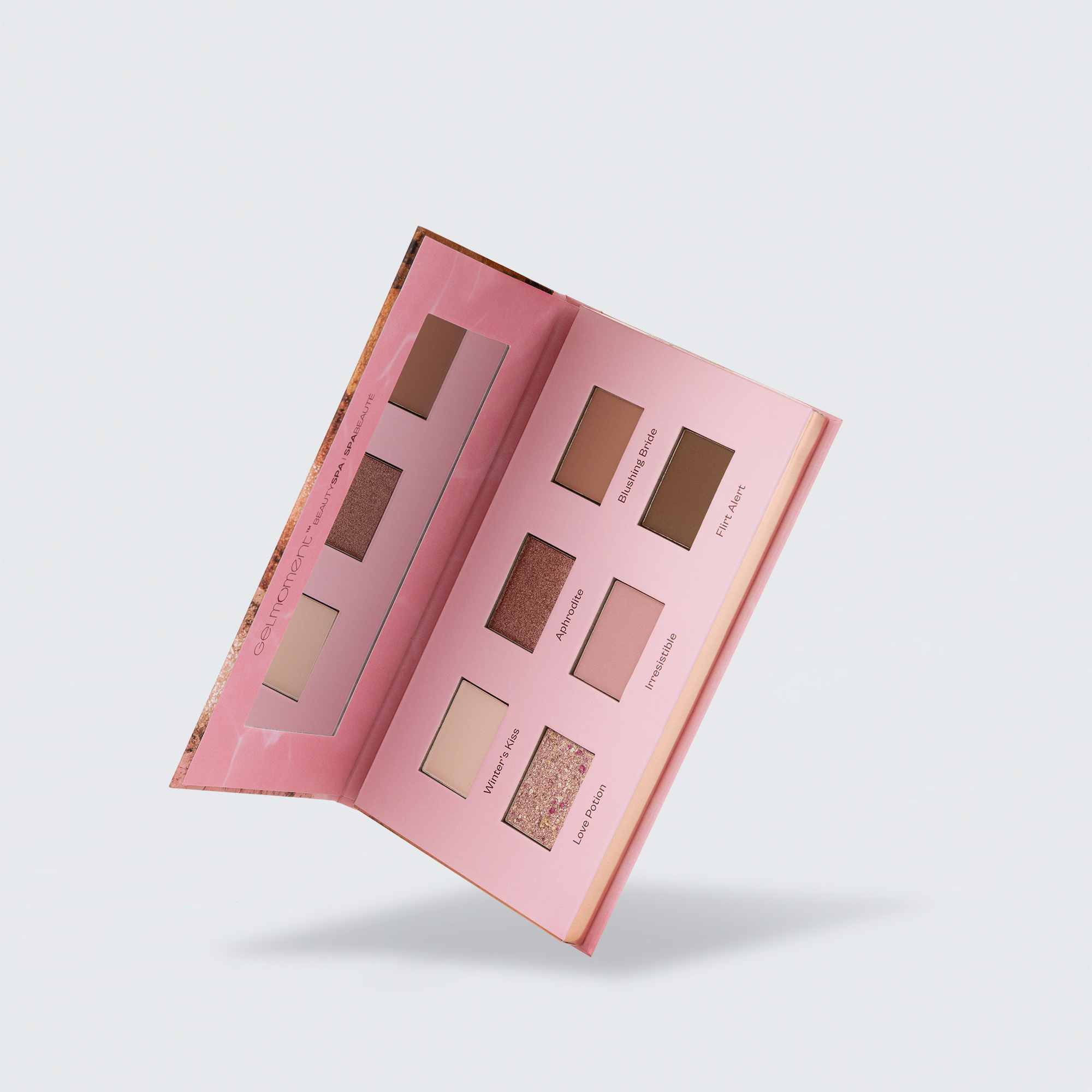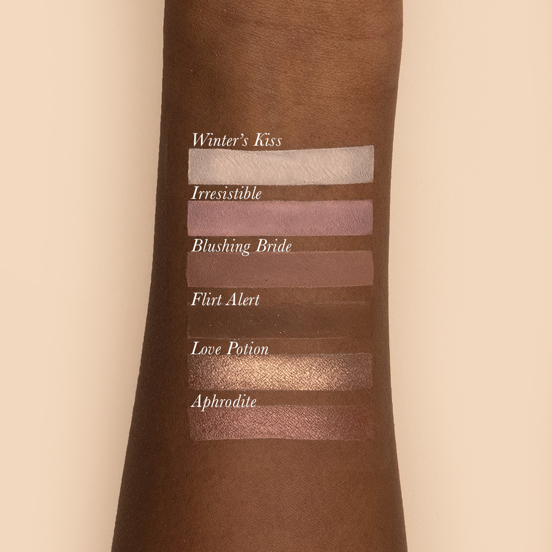 See the world through rose-coloured eyelids with the lovely tones of TOUJOURS Pink Palette: Winter’s Kiss, Aphrodite, Blushing Bride, Love Potion, Irresistible, and Flirt Alert.